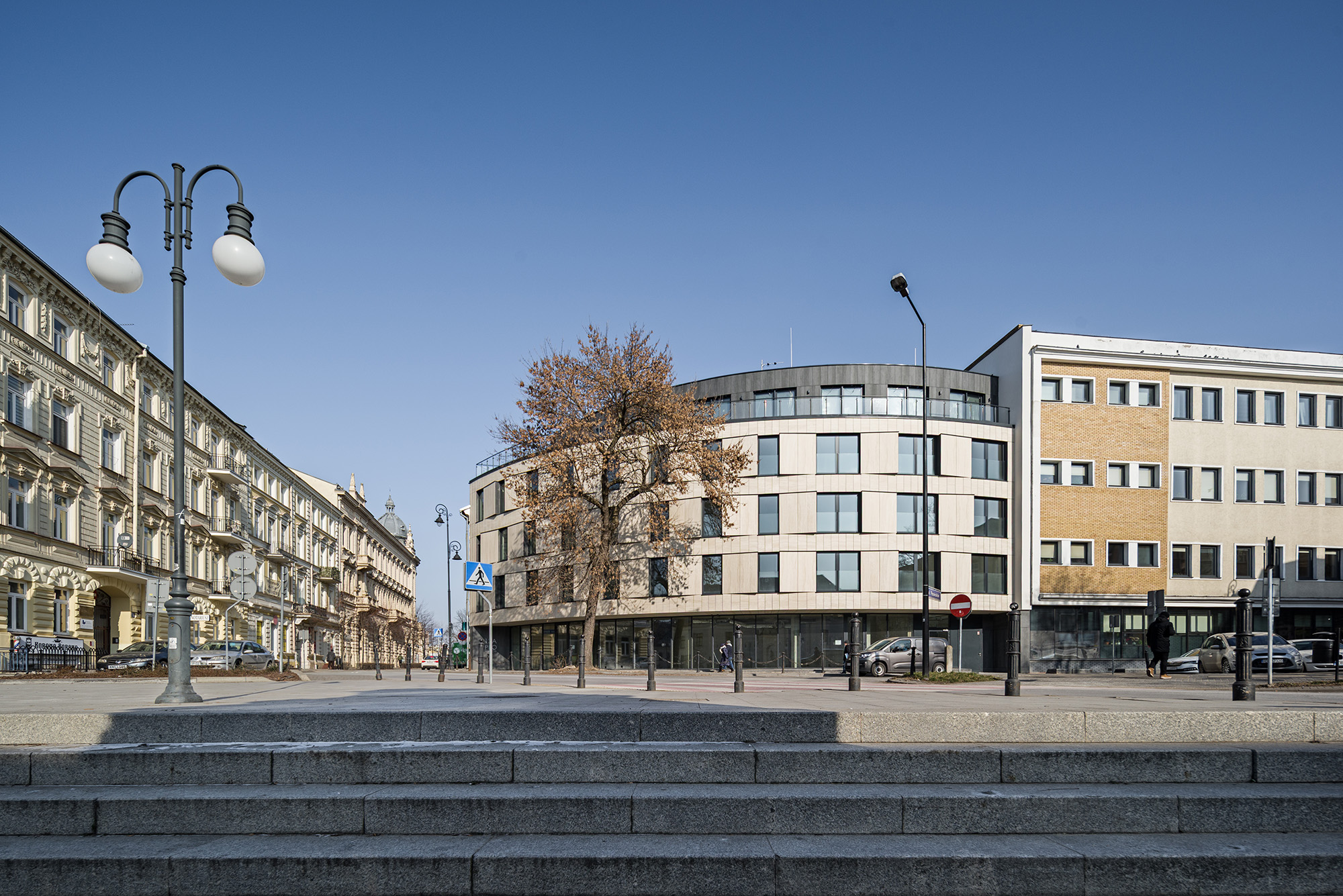 Nowoczesny, kameralny budynek mieszkalno-usługowy, wykończony piaskowym spiekiem, dzięki czemu harmonijnie wpasowuje się w śródmiejską zabudowę.